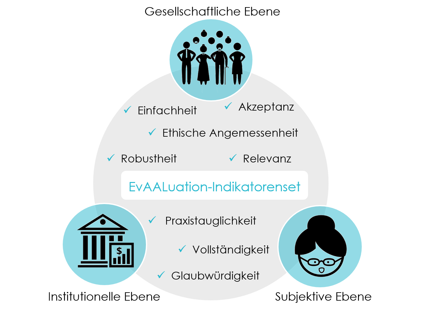 Deshalb zielt EvAALuation² darauf ab, die Basis für eine Evaluation der angestrebten Wirkung von AAL-Produkten und -Services auf subjektiver, institutioneller und gesellschaftlicher Ebene bereitzustellen. Auf Basis des EvAALuation entwickelten Indikatorenset, werden, konkrete Messinstrumente für die Evaluierung der Wirkungen von AAL-Lösungen entwickelt, wobei der Fokus auf drei konkrete Anwendungsbereiche (Gesundheit, Pflege und Humanpotantial sowie Tätigsein) gelegt wird. Für non-reaktive Verfahren werden Erhebungsanleitungen und für reaktive Daten Frage- und Antwortitems für standardisierte Befragungen generiert. EvAALuation² folgt dem Total-Survey-Ansatz, der es ermöglicht, zentrale Gütekriterien wie Objektivität, Reliabilität, Validität und Praktikabilität sicherzustellen. Zu diesem Zweck werden StakeholderInnen in mehreren Validierungsschleifen involviert und Daten zu Zwecken der Prozessoptimierung und Generierung von Messwertinterpretationsbelegen (versuchsweise) erhoben. Die Methode der Fallbeispiele unterstützt darüber hinaus die Praktikabilität. Die Transparenz der Methodengenerierung wird in der Aufbereitung in Form eines Handbuchs sichergestellt.